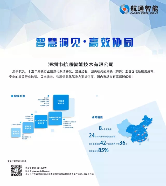 航通智能是國家級高新技術企業(yè)和雙軟認證企業(yè),并獲得CMMI3資質(zhì)認證。歷程十五載,航通智能已于海關行業(yè)監(jiān)管、口岸通關、保稅物流、加工貿(mào)易、物流信息化應用集成領域在全國建設了數(shù)百個特殊監(jiān)管區(qū)與和監(jiān)管場所信息化系統(tǒng)。其中涉及云卡口、大數(shù)據(jù)風險分析、北斗/GPS監(jiān)控應用、RFID射頻識別、移動智能終端等應用技術。業(yè)務覆蓋全國42個直屬海關中的36個,關區(qū)覆蓋率超過85%,核心業(yè)務市場占有突破60%。
