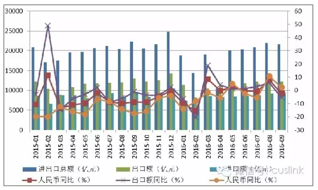 圖表 1 2015年1月-2016年9月我國進出口貿(mào)易逐月情況對比